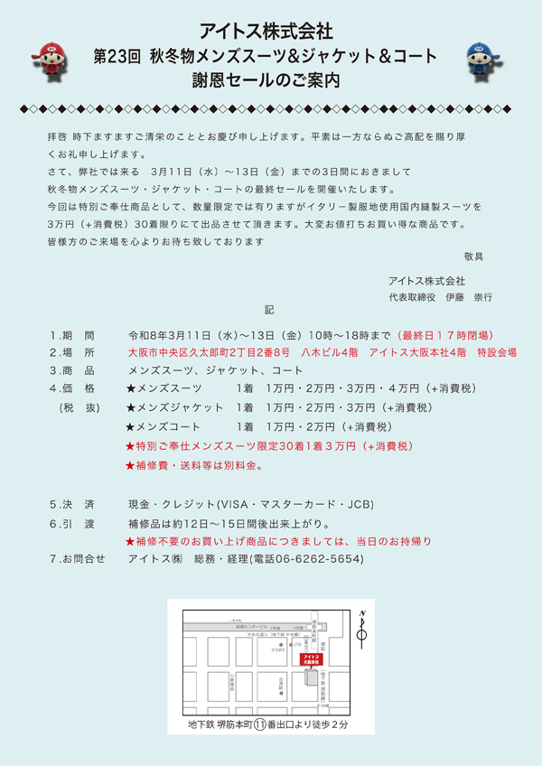 大阪本社にてメンズスーツ&レディーススーツの謝恩セールを開催いたします。