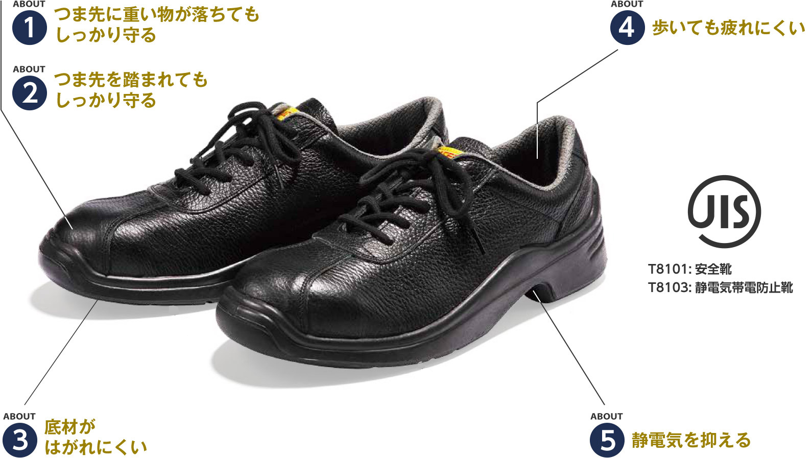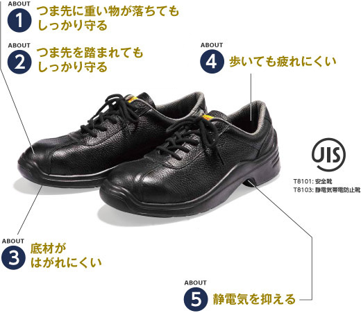 日本産業規格(JIS)が設定した定義は「主として着用者のつま先を先芯によって防護し、滑り止めを備える靴」とされています。しかし、それだけでなく、耐衝撃性能や耐圧迫性能、表底のはく離抵抗、耐踏抜き性(くぎの貫通時の力に耐えられるものかどうか)、かかと部の衝撃エネルギー吸収性、表底の滑り止め効果など細かく分けられ、品質・性能について厳しく検査しています。