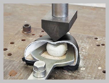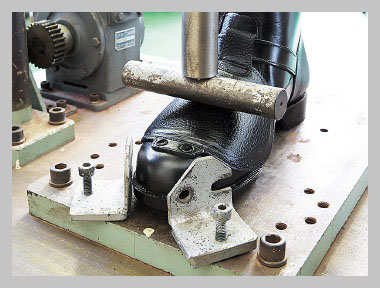 耐衝撃性能<JIS T8101における基本性能>質量20kgで規定の形状をした鋼製ストライカを、 作業区分毎に決められた高さから自由落下させることにより、所定の衝撃エネルギーを安全靴の先芯部に与え、 規定の隙間を確保できることが求められる。