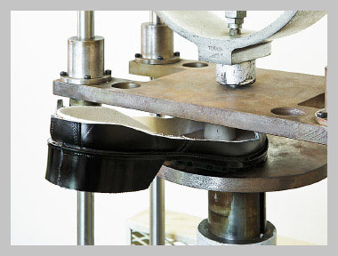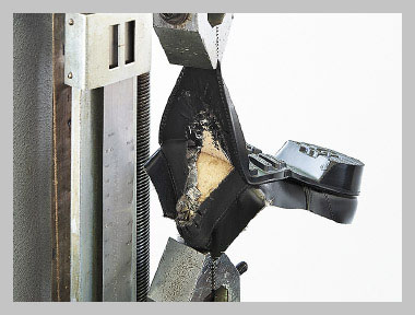 甲被と表底の剝離抵抗<JIS T8101及びJIS T8103における基本性能>表底と甲被のつま先先端部をつかみ、互いに反対方向に所定の速度で引っ張り計測。 規定の強度を確保できることが求められる。