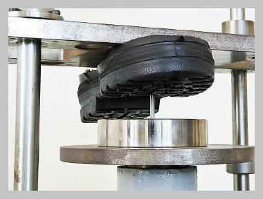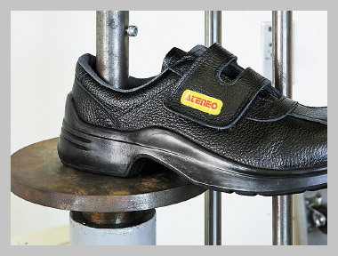 かかと部の衝撃エネルギー吸収性(E)(付加的性能)規定の形状をした冶具を、かかとの中心部にあて、 所定の速度で徐々に圧迫力を加え測定。吸収エネルギー20J以上が求められる。