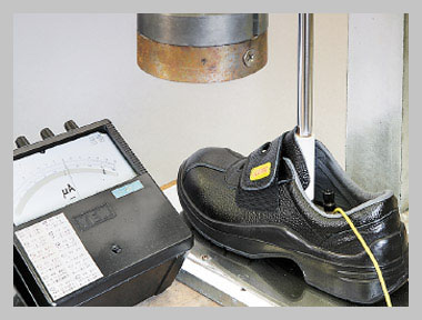 静電気帯電防止性能<JIS T8103における基本性能>靴の中底と表底の接地面に電極を接し、靴を履いた状態に近づけた荷重をかけ直流100±1Vの電圧を流し、 23℃/0℃のそれぞれの温度条件と環境区分の条件に合わせた湿度条件で電流を計測。 規定の電気抵抗を確保できることが求められる。